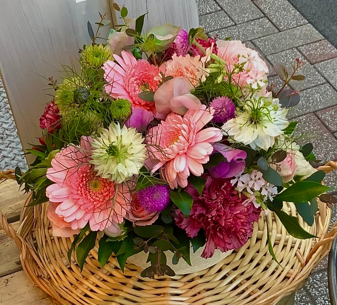 胸が高まる、ピンク系の季節のおまかせflowerギフトです。特別な日のお祝い、お礼や感謝の気持ちを伝える贈り物としてもおすすめです。様々な花々を組み合せています。
